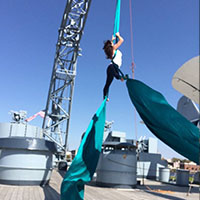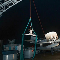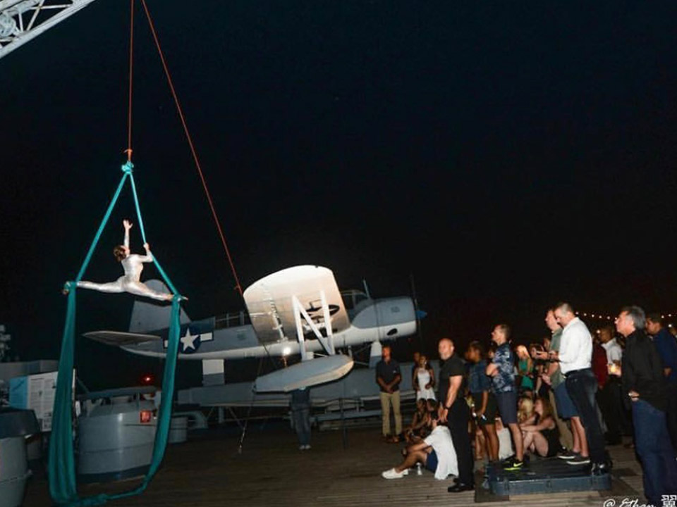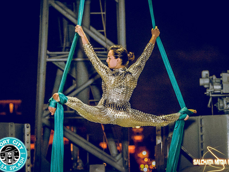 An aerial performance from a 40ft crane off the USS North Carolina Battleship for the Port City Salsa Splash in Wilmington, NC. The Port City Salsa Splash is a wonderful dance festival on the beautiful beaches of North Carolina.
